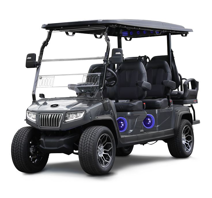 Unser BT-Golfcars Modell D5R4+2 mit zwei Reihen in Fahrtrichtung und eine entgegegen der Fahrtrichtung ist eine Alternative zu klassischen 6-Sitzern in Fahrtrichtung. Die Rücksitzbank lässt sich umklappen und als flache Ladefläche verwenden.